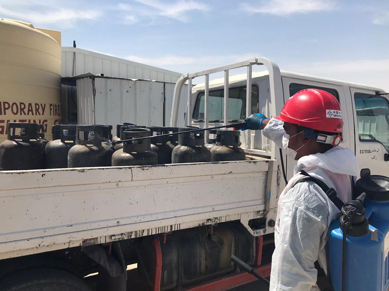 T-1158項目地處沙漠腹地,項目四周全部設(shè)置了鐵絲網(wǎng)與外界隔離,項目部因地制宜實行全封閉式管理模式,主抓外防疫情輸入工作。在項目兩個入口處均設(shè)立了門禁崗?fù)ぃ瑢θ雸鲕囕v、人員進行嚴(yán)格的消殺消毒、體溫監(jiān)測、登記備案工作,有效降低了輸入性風(fēng)險。同時,項目部將外籍員工一并納入中方防疫工作體系,旨在徹底消除輸入風(fēng)險源。增加了臨時居住板房,將外籍勞務(wù)人員轉(zhuǎn)移到項目內(nèi)集中居住。同時,安排并協(xié)調(diào)設(shè)備供應(yīng)商和分包商在項目圍欄區(qū)內(nèi)搭設(shè)臨時住房,以供其操作手和勞務(wù)人員居住,并強制規(guī)定所有人員在進入項目后未經(jīng)批準(zhǔn)禁止外出。此外,項目部還制定了嚴(yán)格的疫情防控管理流程,分別對主辦公室、現(xiàn)場辦公室、中方人員營地、外方勞務(wù)營地、分包商勞務(wù)營地五個區(qū)域進行網(wǎng)格化管理,安排專人、兼職安全員每天對各區(qū)域進行兩次消殺處理。在各區(qū)域張貼佩戴防護口罩、一次性手套等門禁標(biāo)識,定時定點進行覆蓋全員的體溫檢測工作,并登記實時日志,確保項目內(nèi)部各區(qū)域疫情防控工作全覆蓋,營造安全、健康的項目部工作、生活氛圍。