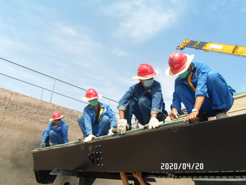 在沒有人手的時(shí)候,項(xiàng)目部打破工種限制,29個(gè)中方員工從上到下,披掛上陣。那些曾經(jīng)手握鋼筆、敲擊鍵盤的手,現(xiàn)在拿起了扳手、拉起了起吊葫蘆。大家不分部門,不分你我,相互配合,做好現(xiàn)場(chǎng)的施工工作。桁架上,項(xiàng)目經(jīng)理正在搖閘門手柄,技術(shù)人員在調(diào)整抱閘間隙;起重機(jī)旁,有人在搬枕木,墊支腿,穿繩掛鉤;另一個(gè)作業(yè)面上,有人頂著太陽在打孔,焊接,打磨,拼裝。每個(gè)人的額頭上都堆滿了汗珠,汗水打濕了衣服,一天的工作下來,衣服后背上都有一道道的汗?jié)n,一圈圈的汗花,卻沒有一個(gè)人叫苦叫累。