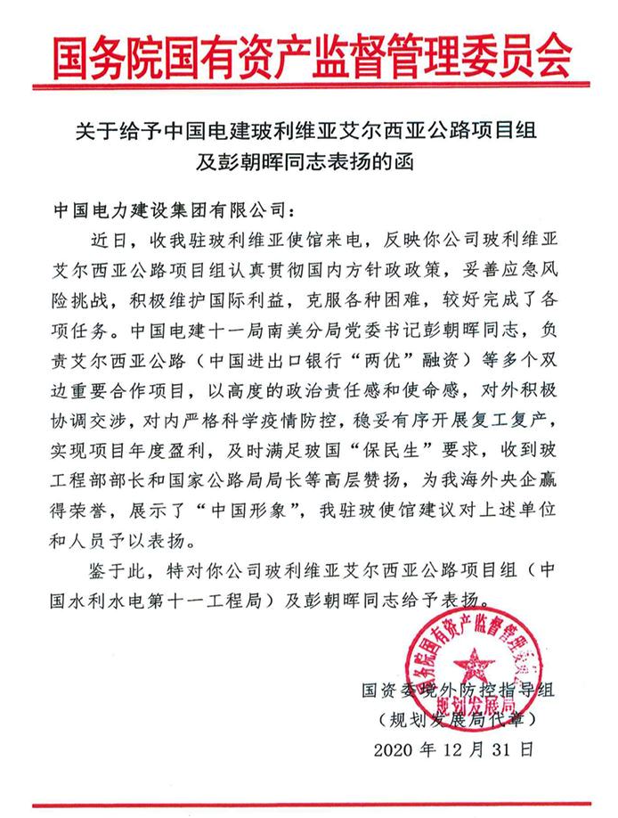 國(guó)資委來(lái)函表?yè)P(yáng)中國(guó)電建玻利維亞艾爾西亞公路項(xiàng)目組及彭朝暉同志