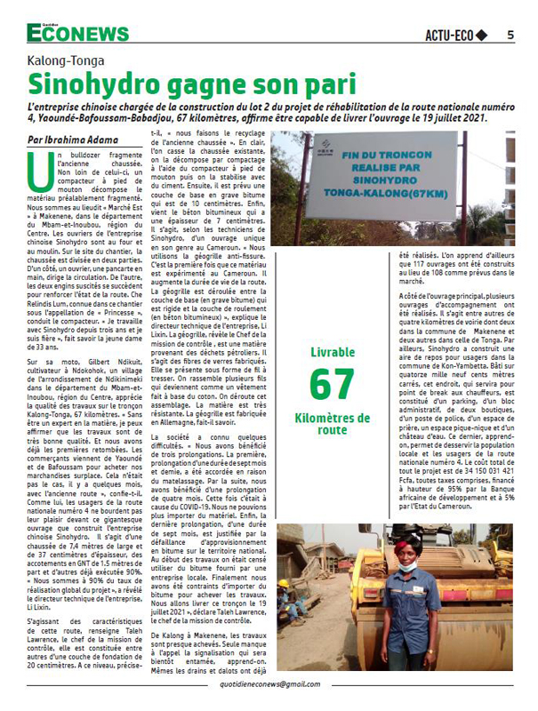 2月25日,喀麥隆當(dāng)?shù)孛襟wECONEWS以頭條刊發(fā)了一篇《道路工程:中國(guó)水電將會(huì)如期完工》的新聞。文章對(duì)中國(guó)電建旗下中國(guó)水電(SINOHYDRO)承建的喀麥隆四號(hào)國(guó)道二標(biāo)段項(xiàng)目的施工情況進(jìn)行了采訪報(bào)道,并對(duì)中國(guó)水電的履約能力表示贊賞。